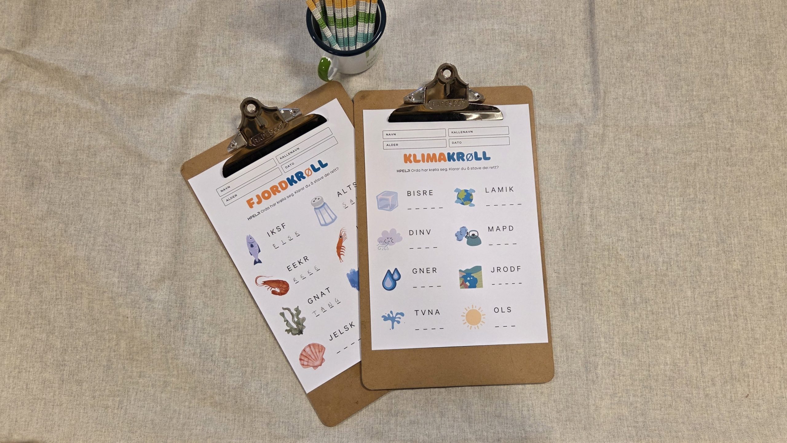 Hjelp! Bokstavane har blitt stokka om. Klarar du å stave dei rett? Orda som må rettast på er delt inn i fire tema; klima, insekt, fjord og dyr. Du kan kan laste ned PDF-fila, skrive ut og løyse oppgåvene heime. Lykke til!