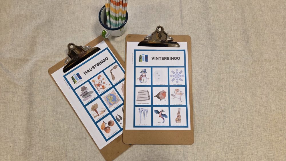 Last ned Folgefonnsenteret sin heilt eigne turbingo. Dei fire bingoarka er delt inn etter årstidene; vår, sommar, haust og vinter. Skriv ut arket og set kryss etter kvart som du har løyst oppgåvene. Nokre oppgåver legg opp til fri fantasi, så her er det om å gjere og vere kreativ. Kan du telle tre ulike fuglar på vinteren og klarar du å finne tre ulike lauvtre? Lykke til!